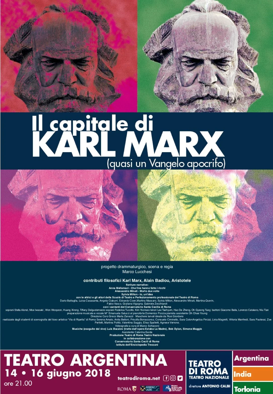 “………Venticinque giovani artisti in scena tra attrici, attori, cantanti e musicisti che in collaborazione con il Conservatorio di Santa Cecilia, l’Istituto dell’Enciclopedia Treccani, il Progetto Speciale MIBACT, il “Liceo Artistico Via di Ripetta” e la produzione del Teatro di Roma, soffiano nel vento della storia come strumenti formidabili e potenti per una drammaturgia dei concetti, articolata e messa in scena da Marco Lucchesi, attraverso l’incarnazione attoriale di tesi, contro tesi, antitesi e riflessioni contenute ne Il Capitale di Karl Marx. Uno spettacolo che alterna l’opera alla prosa, il canto al poema, la Canzone di giacca napoletana a Bob Dylan a Luis Bacalov con le note di “Estaba la madre”, opera gravida del dolore della tragedia argentina, in grado di accogliere un nuovo testo con altri dolori di altre tragedie.